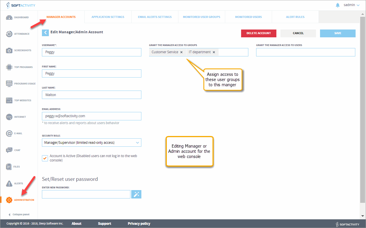 - Admin can create accounts for supervisors in SoftActivity Web Console and assign access only to users in their respective departments.