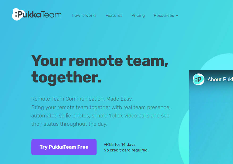 Remote teams can feel distant from their colleagues. Pukkateam brings your remote team together by providing automated selfie photos and the option to place simple video calls.