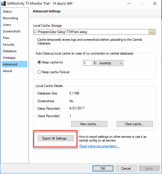- Install SoftActivity TS Monitor on a server, and setup all program settings as required: what actions you’d like recorded, database connection parameters, local cache file, list of monitored users, etc.